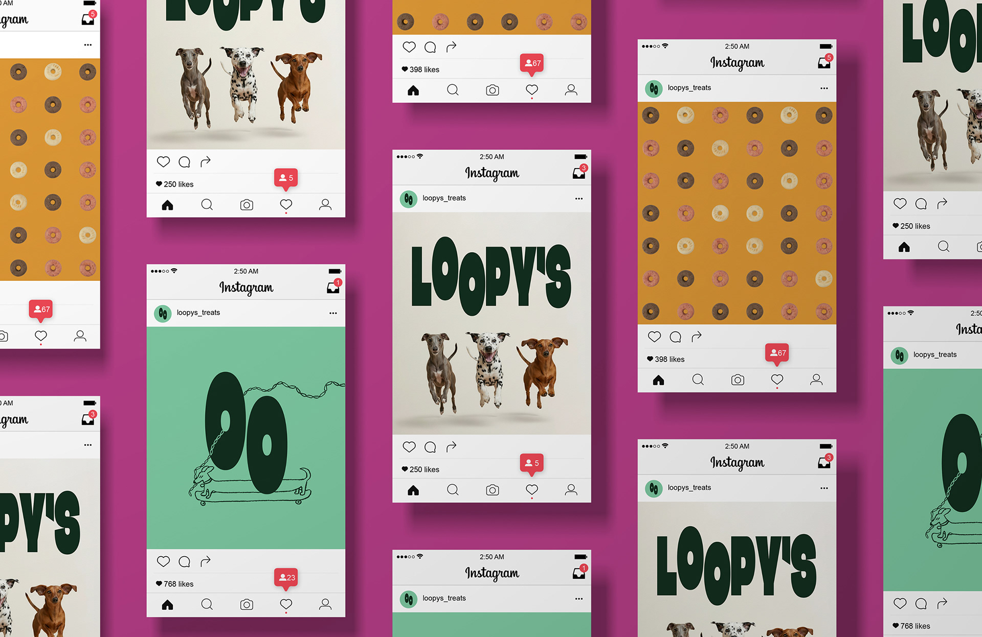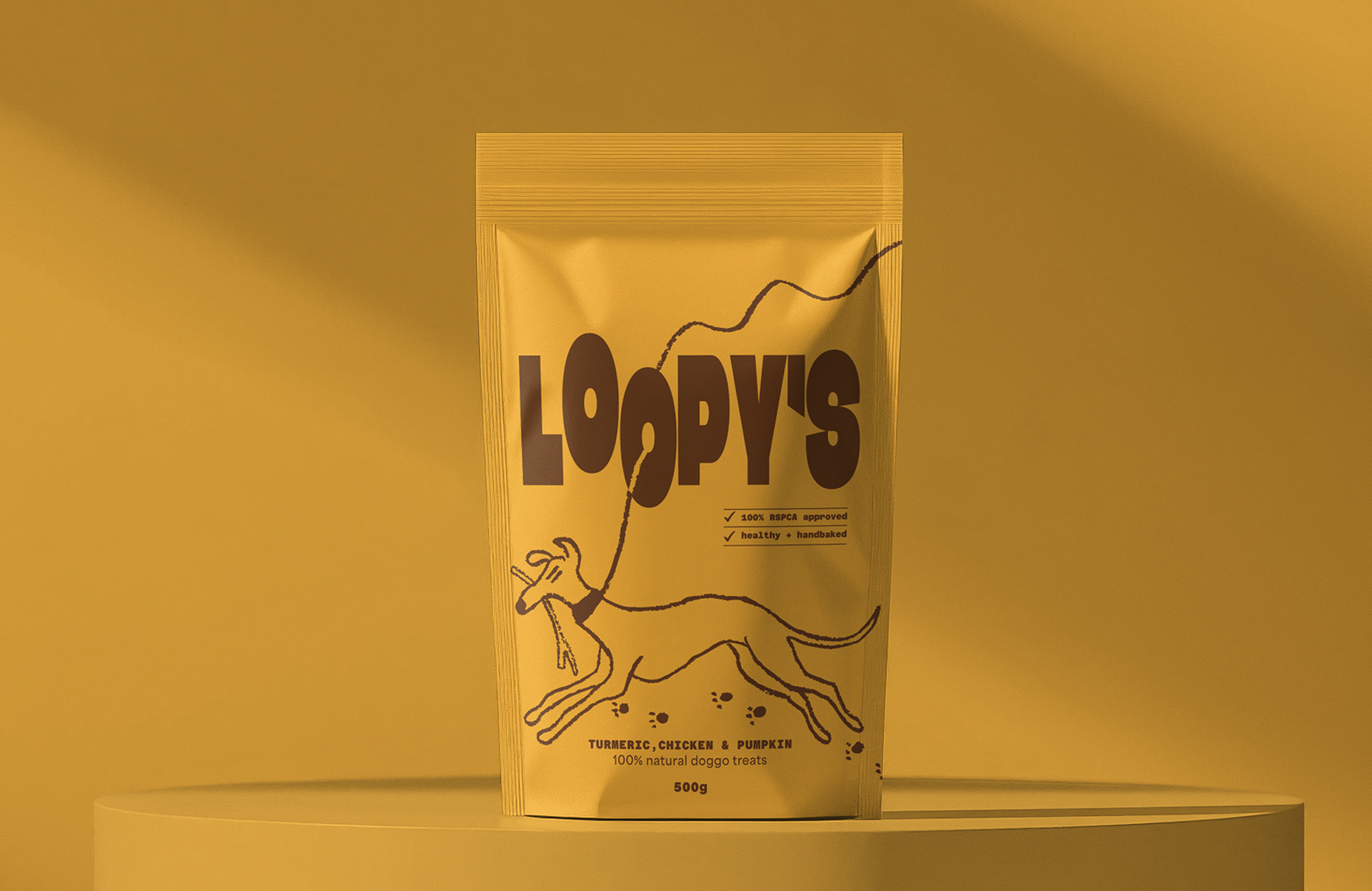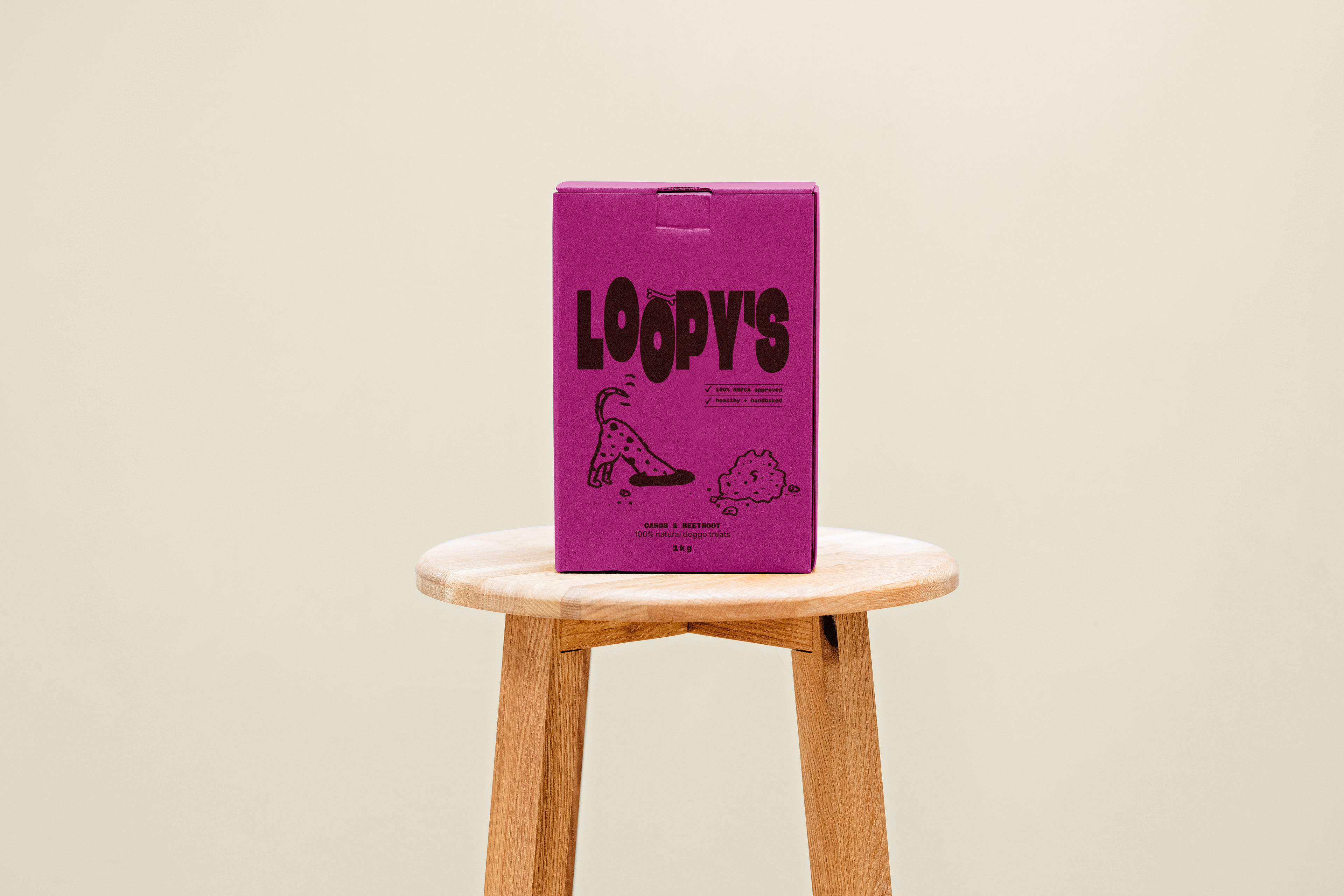 Loopy’s is a new natural, hand-baked dog treat company aimed at adventure seeking families and their crazy pooches. My hand-drawn, wacky packaging illustrations set out three unique canine characters that sit alongside three artisan flavours. The treats are loop shaped to fit with the brand story. A bright palette stands out on the shelf, and hints at the tasty flavour of treat.