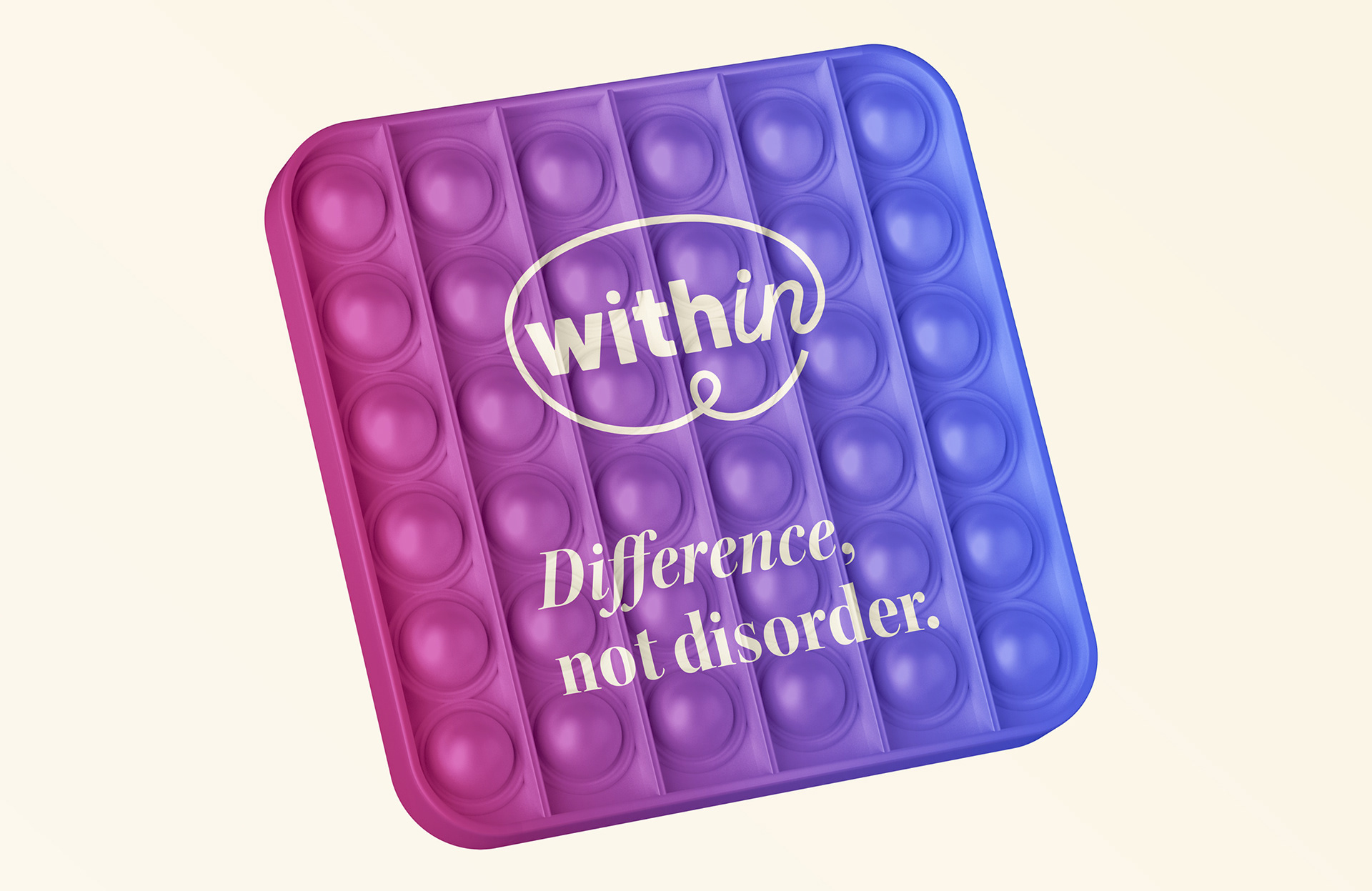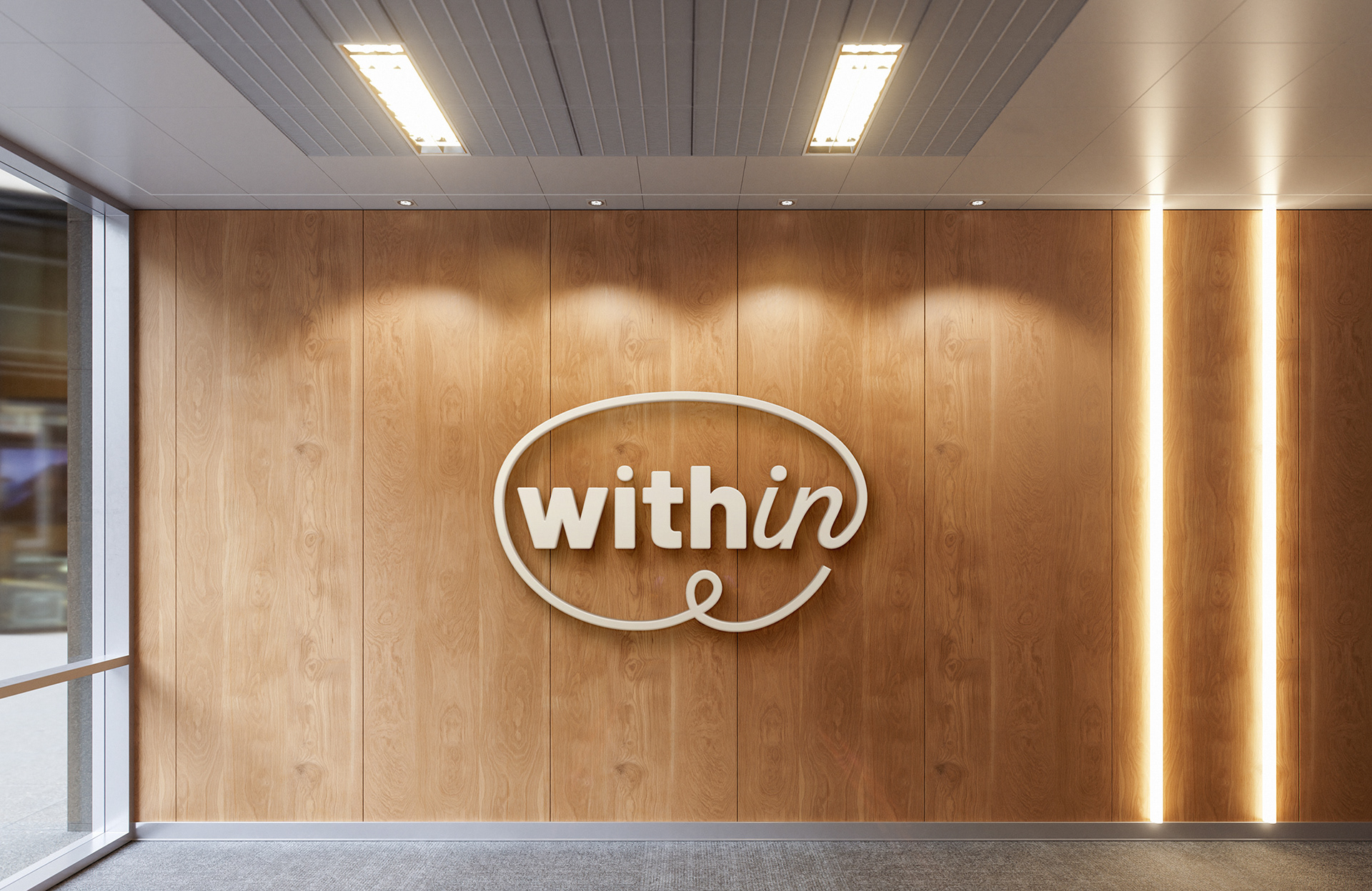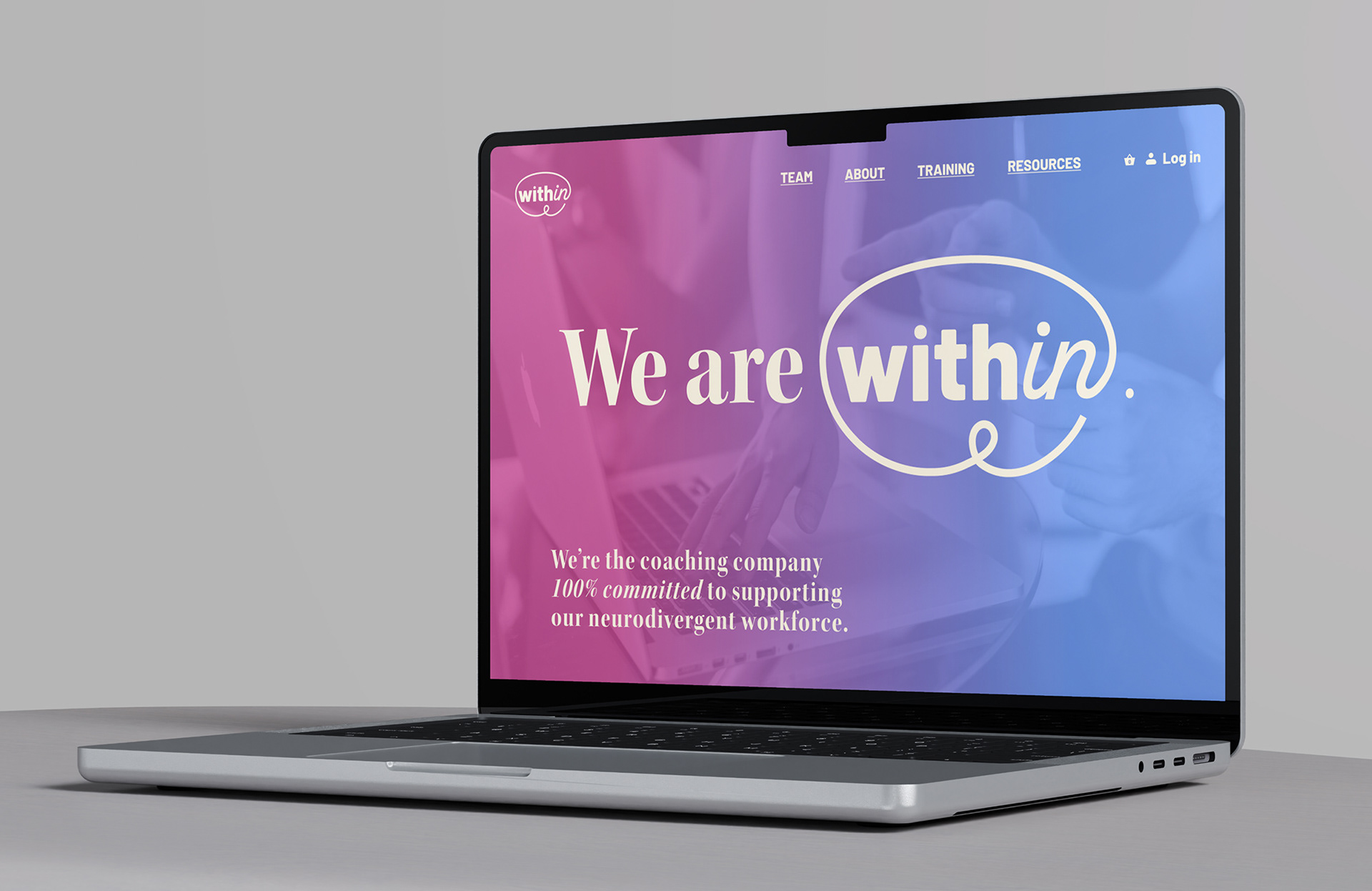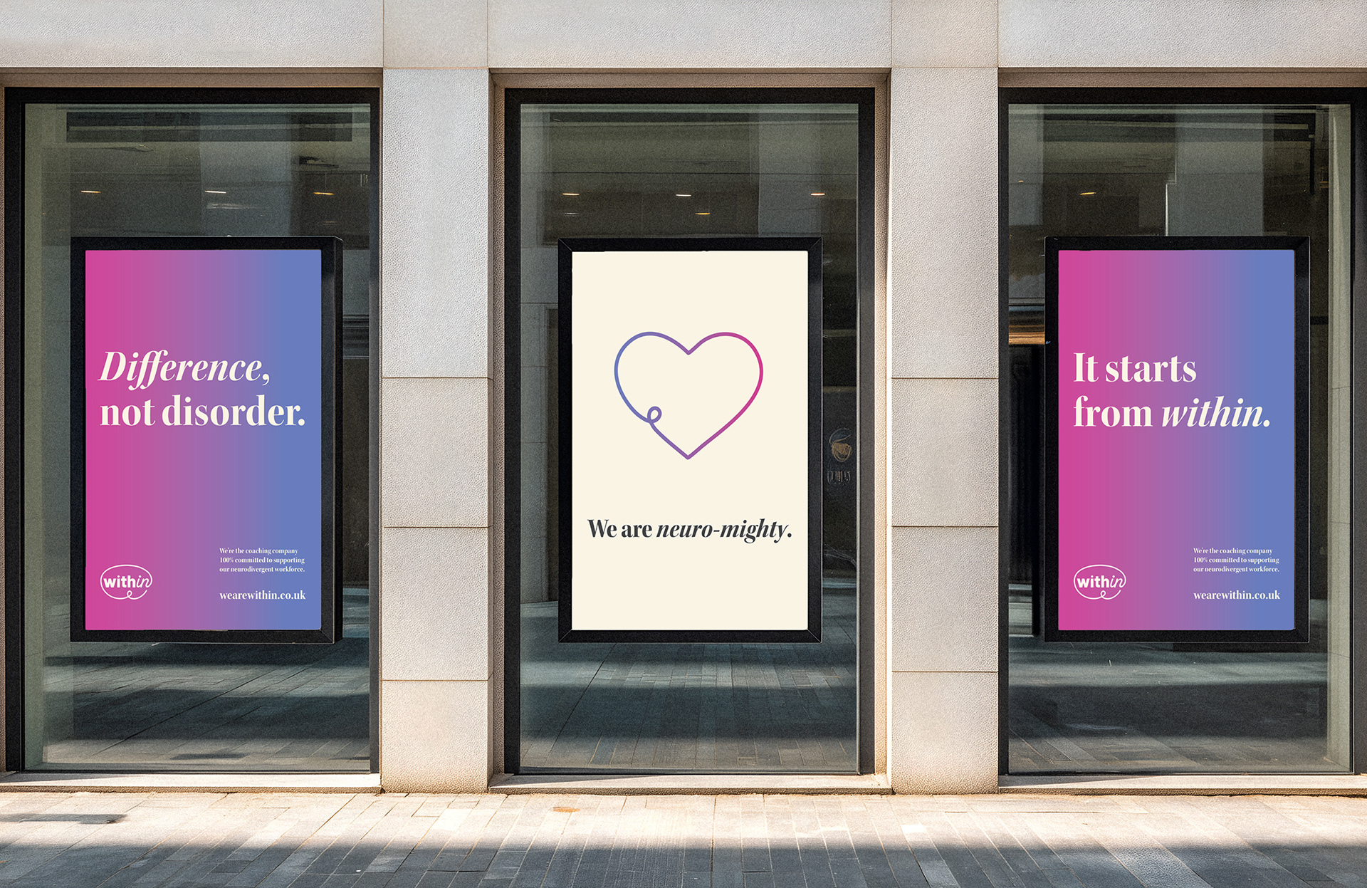 Within is a new neurodiversity coaching company designed to both stand out in a corporate setting and to avoid any commonly used visual cliches. The word-mark uses two contrasting typefaces encapsulated by a swoosh and sits against a gradient background to reiterate the concept of inclusivity. The logoform gently and subtly references a brain form, and the loop is a nod to different and interesting ways of working and how many neurodivergent individuals have untapped talents. This has informed the basis of a complete set of icons.
